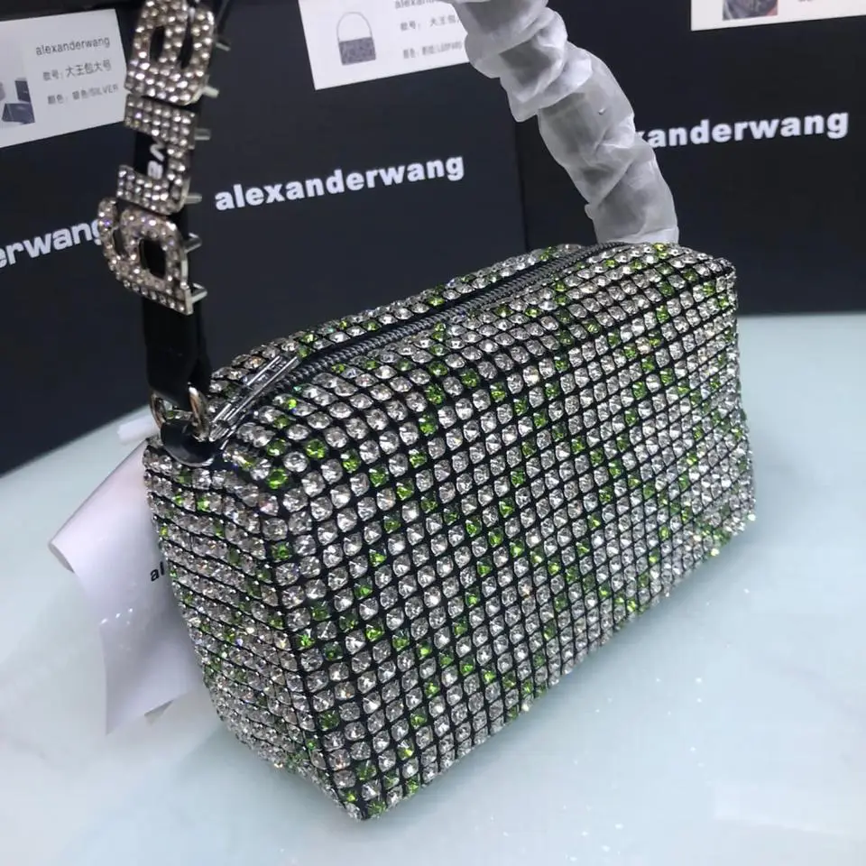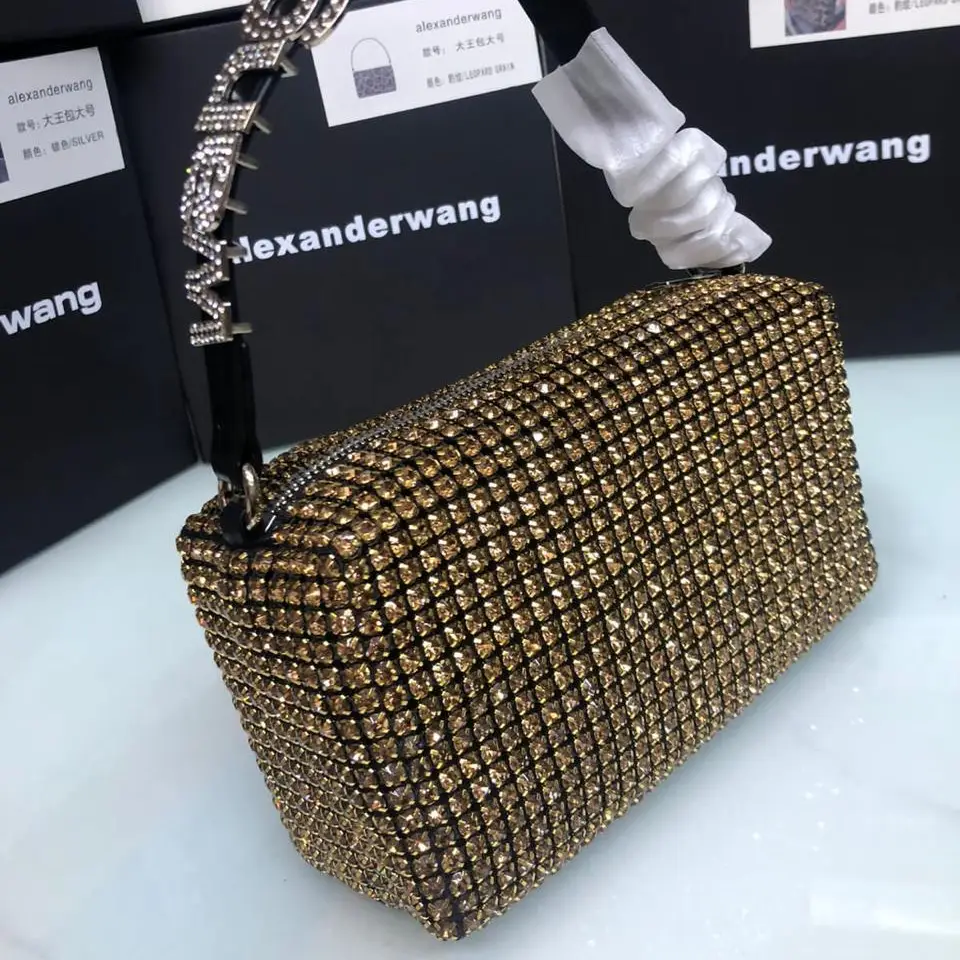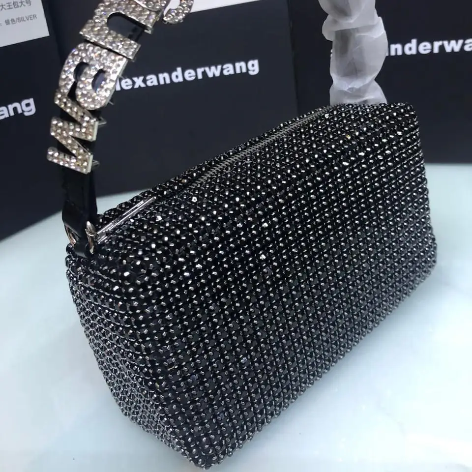 The Alexander Wang Heiress Bag is a dazzling statement piece known for its ultra-glamorous, crystal-embellished design. A favorite among fashion-forward trendsetters, the bag features a shimmering mesh of rhinestones or crystals that give it a bold, high-shine aesthetic perfect for evening wear or elevated street style. Its compact, structured silhouette paired with a branded top handle embossed with the Alexander Wang logo makes it instantly recognizable and stylishly distinct.