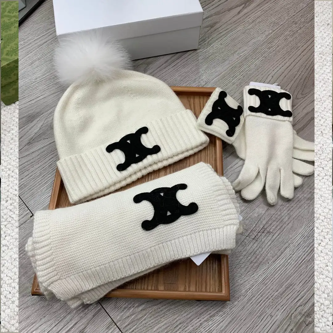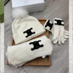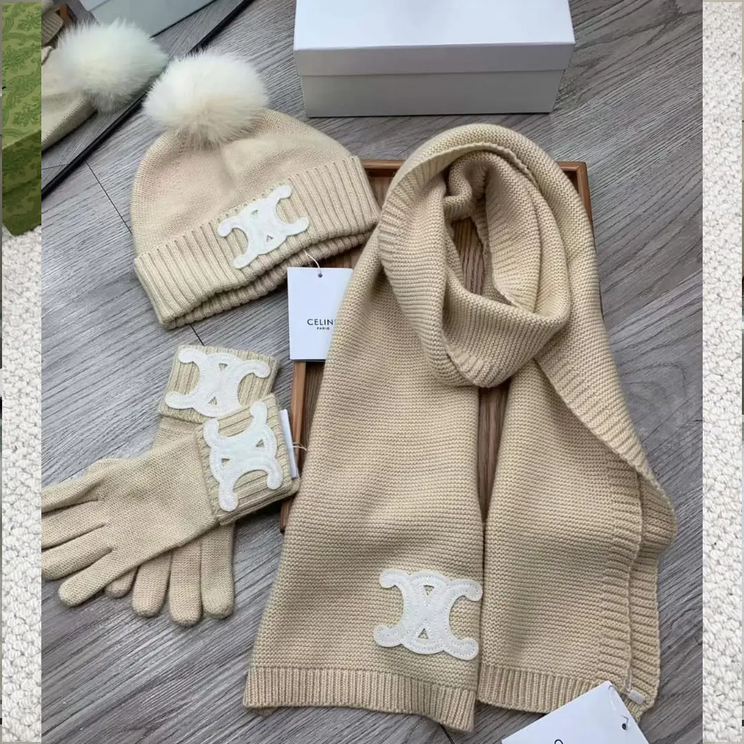 Celine Ribbed Wool Scarf Set – Beanie, Scarf & Gloves with Celine Logo Patch in Dubai UAE