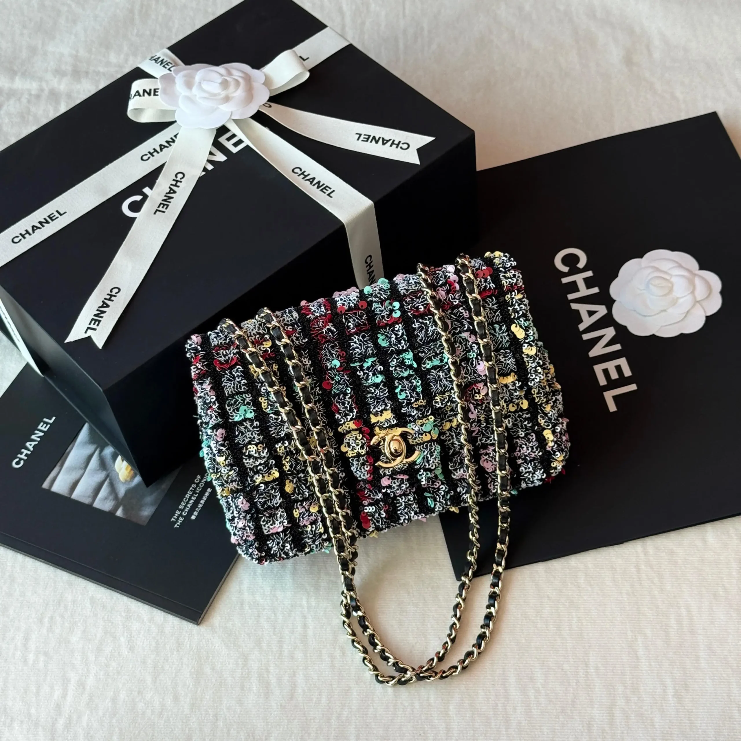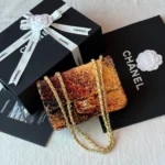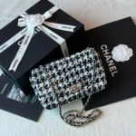 The Chanel Mini Classic Bag in a striking black and white houndstooth pattern is a stunning fusion of classic elegance and bold flair. Adorned with colorful jewels and pearls, this limited-edition piece exemplifies Chanel’s creativity and luxurious craftsmanship. The bag retains the signature rectangular shape, complete with the iconic interlocking CC logo and gold chain strap interwoven with leather. Its compact size and standout design make it a perfect accessory for evening events or to elevate everyday fashion.