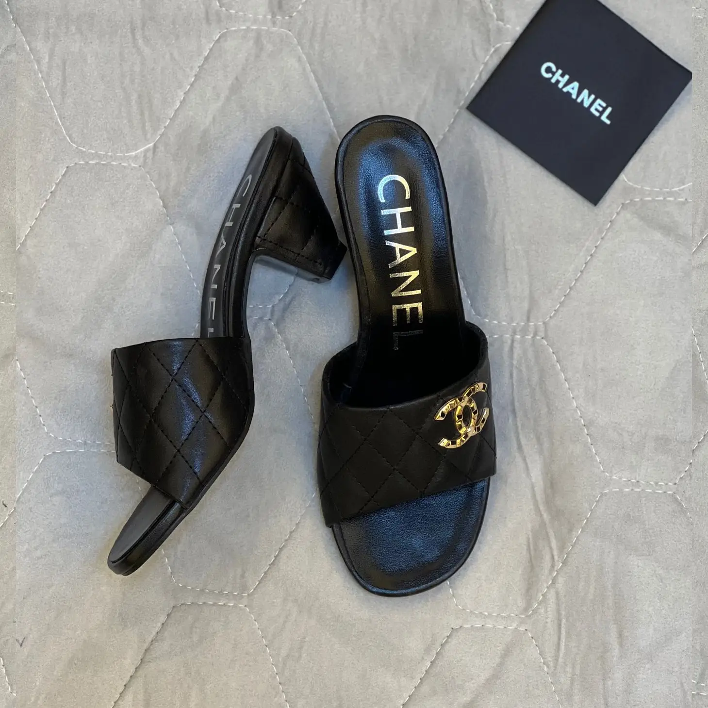 Chanel Quilted Mule Slippers – Gold Logo Detail & Small Heel in Dubai UAE