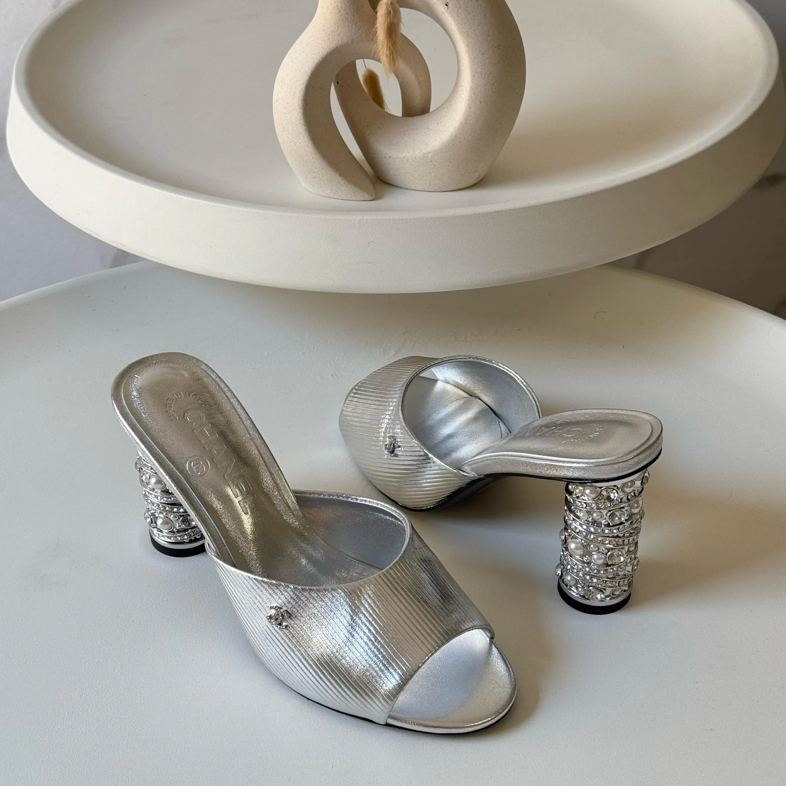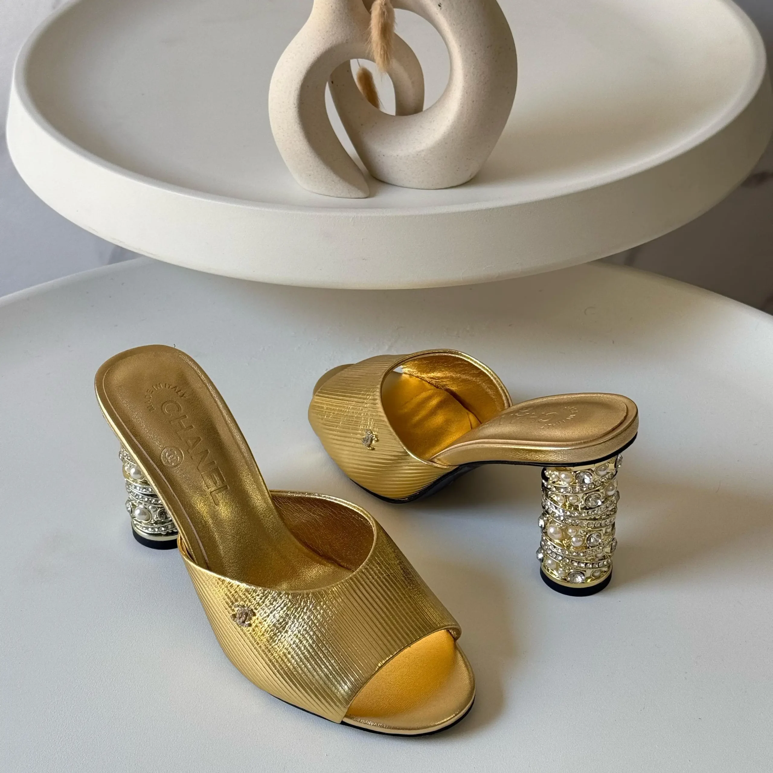 Chanel Slingback Mules – Low Block Heel with Pearl or Crystal Detail & Subtle CC Logo in Dubai UAE