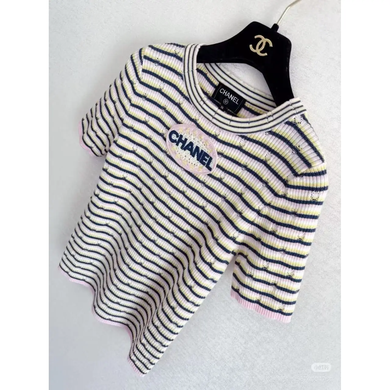 Step into effortless luxury with this Chanel Short-Sleeved T-Shirt, a standout piece from the brand’s Ready-to-Wear collection. Designed in a bold striped pattern of black, white, and yellow, the top is accented with playful pink trim on the sleeves and hem, bringing a youthful yet refined energy to your look. The centerpiece is a prominent oval-shaped “CHANEL” logo patch on the front, offering iconic branding in a subtly elevated form.