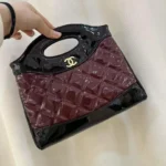 Introducing a sophisticated burgundy handbag that captures the essence of luxury fashion, reminiscent of classic Chanel designs. This elegant bag features a rich, deep burgundy hue and a timeless diamond-quilted pattern on its lower section, adding a touch of refined texture. The sleek top-handle design with a distinctive cutout provides a comfortable grip and a unique silhouette, while the prominent gold-tone “CC” logo at the centre instantly elevates its allure. Perfect for both daytime and evening affairs, this bag offers a compact yet functional space for your essentials, blending style with practicality.