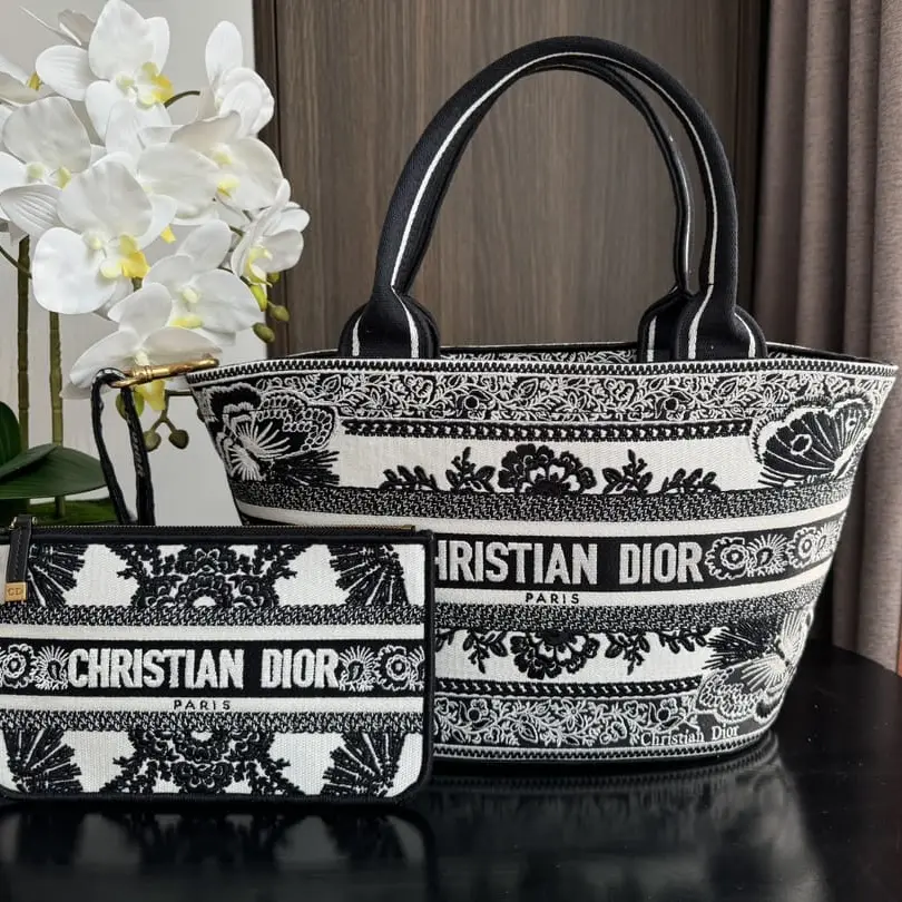 The Christian Dior Book Tote is one of the most recognizable and sought-after designs from the French luxury fashion house. Featuring the signature Dior Oblique pattern and the prominent “Christian Dior Paris” logo on the front, this tote bag is both a fashion statement and a symbol of timeless elegance. Crafted from durable canvas, it blends functionality with style, making it ideal for everyday use, travel, or work.