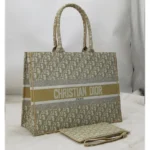 The Christian Dior Book Tote is an iconic staple in the world of luxury fashion, celebrated for its spacious design and signature aesthetic. Crafted from durable canvas and adorned with the all-over Dior Oblique pattern, this large tote is both stylish and highly functional. The front prominently features the “CHRISTIAN DIOR” logo, making a bold statement while staying true to the brand’s timeless elegance.