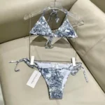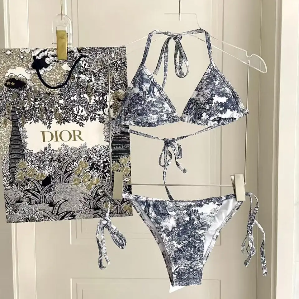 The subtle yet sophisticated branding, confirmed by the accompanying “DIOR” shopping bag, further solidifies its luxury status. Designed for both style and comfort, this bikini offers a supportive fit and stretchable fabric perfect for sun-soaked days. Whether worn poolside or as part of resort wear, it exudes effortless chic and couture-level design.