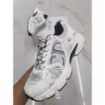 The Dior Chrono Sneaker brings together futuristic design and timeless luxury. Crafted in a sleek blend of gray mesh and silver-tone laminated leather-effect panels, this women’s sneaker is both lightweight and visually striking. The design reflects Dior’s attention to modern performance aesthetics, while subtle nods to heritage—such as the iconic Dior Oblique pattern—add a layer of brand distinction.