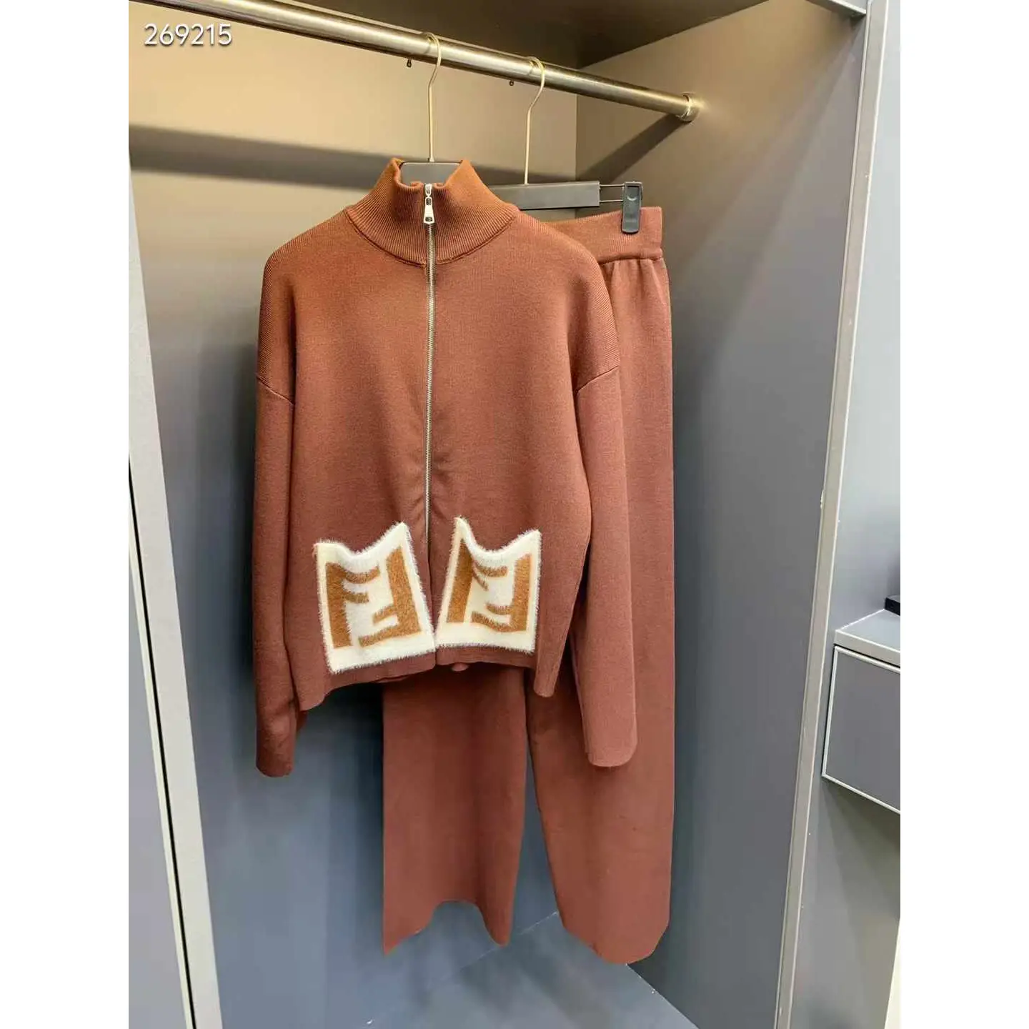 The two-piece set includes a zip-up top and coordinated bottoms, both designed with meticulous attention to detail, combining functionality with luxury. The knitted texture adds a tactile richness, while the iconic FF logo injects a bold designer statement into your everyday wardrobe.