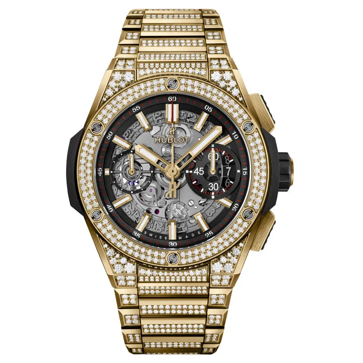 Powered by Hublot’s reliable Unico chronograph movement, the Big Bang Platinum Diamond Pave not only impresses with its aesthetics but also with its precision and performance. The watch features a skeleton dial that allows the wearer to see the inner workings of the movement, showcasing Hublot’s dedication to transparency and technical prowess. The rubber strap ensures comfort and durability, while the 100-meter water resistance provides practicality. Whether worn for a special occasion or as a daily luxury accessory, the Big Bang Platinum Diamond Pave 42mm offers a striking blend of high-end craftsmanship, innovative design, and timeless elegance.