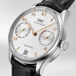 The IWC Portugieser Automatic IW500704 is a luxurious and timeless timepiece that showcases the perfect balance of classic design and advanced Swiss watchmaking. Housed in a 42mm silver case, this watch features a stunning white dial with blue steel hands and Arabic numerals, giving it a refined, sophisticated look. The minimalist design includes a small seconds sub-dial at 6 o’clock and a date display at 3 o’clock, offering both elegance and practicality. Powered by the IWC-manufactured 52010 caliber, this automatic movement provides an impressive 7-day power reserve, ensuring the watch runs smoothly for extended periods without needing to be wound.