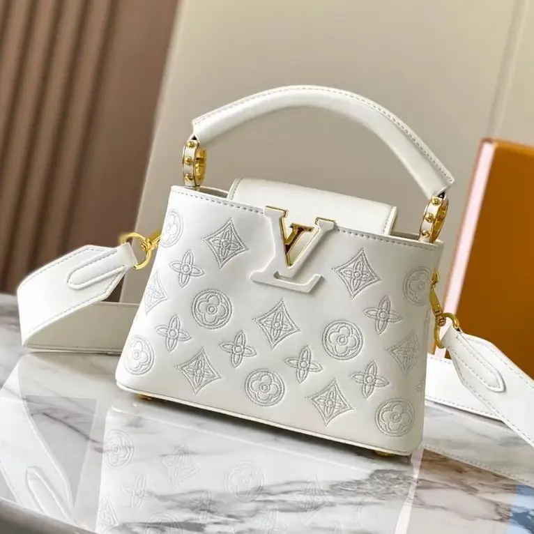 The featured bag is crafted in white leather embossed with the Monogram pattern, showcasing the house’s mastery in materials and detail. It includes leather-wrapped LV initials and a flap that can be styled two ways: either tucked in to reveal the LV logo or worn outside to display the Monogram Flower. A detachable shoulder strap offers versatility for both shoulder and crossbody wear, making the Capucines perfect for everyday luxury or formal occasions.