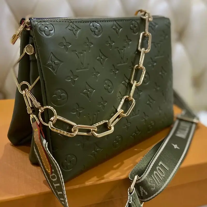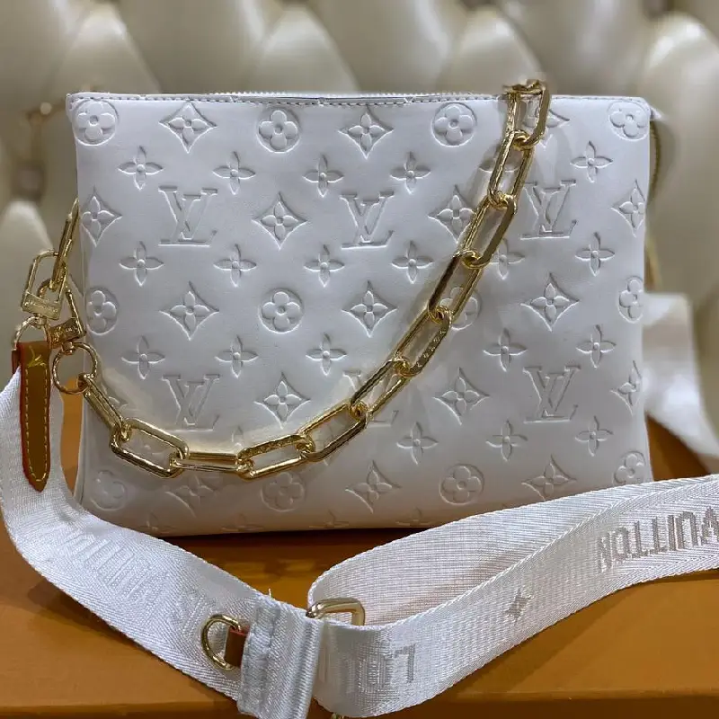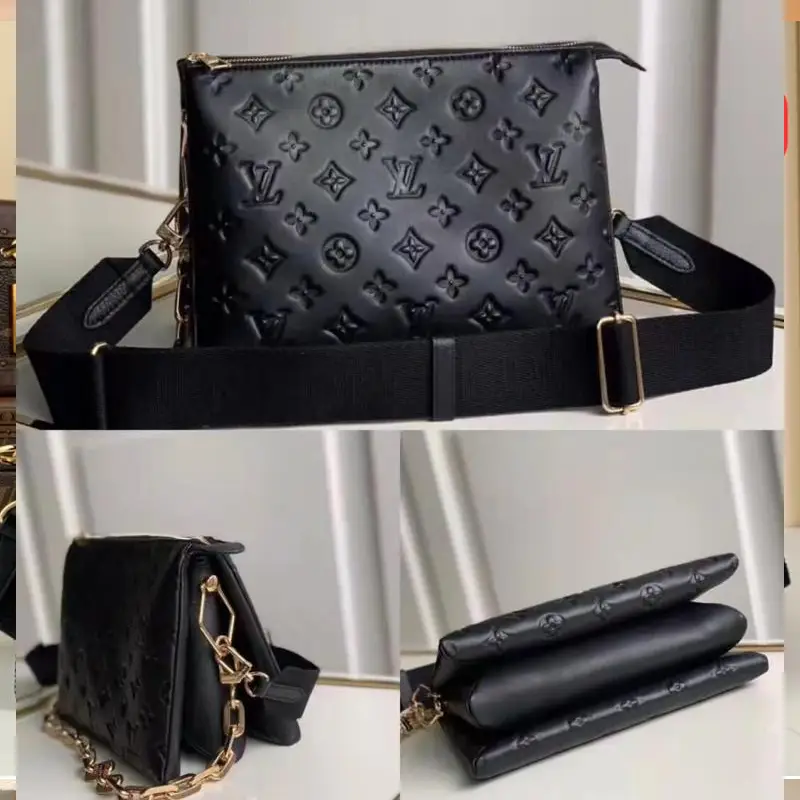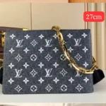 The Louis Vuitton Coussin PM is a bold yet elegant handbag designed for both comfort and versatility. Made from Monogram-embossed puffy lambskin, the Coussin PM showcases the brand’s luxurious craftsmanship in a modern silhouette. Its unique design includes a wide, adjustable textile strap and a chunky metal chain, offering multiple carrying options to suit any style or occasion. Whether worn cross-body, over the shoulder, or tucked under the arm, this statement bag is as functional as it is fashionable.