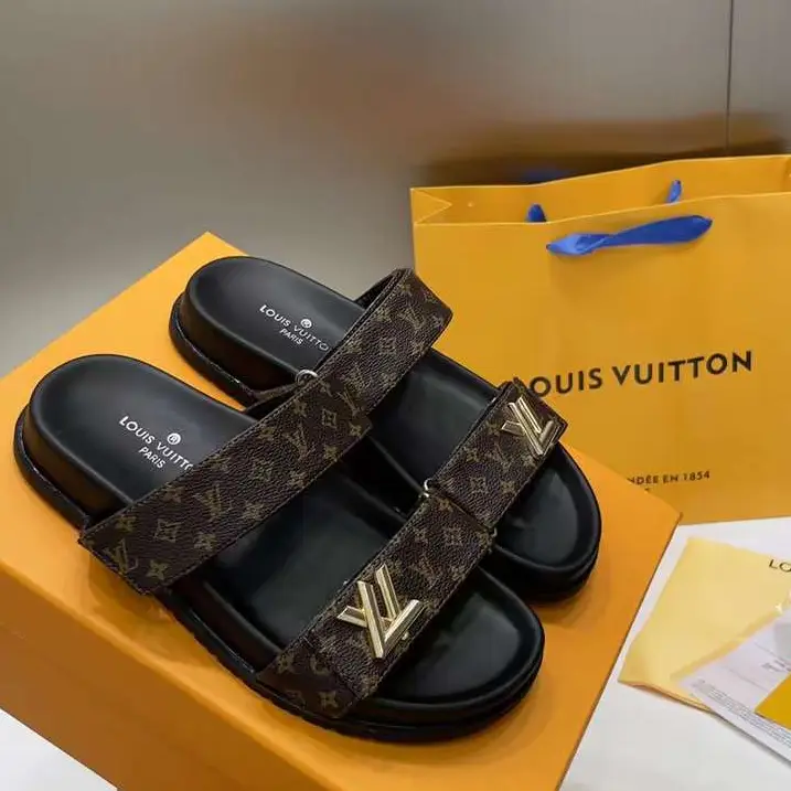 Indulge in elevated comfort and unmistakable luxury with the Louis Vuitton Monogram Waterfront Slides. These premium slides feature the iconic LV monogram pattern across the wide strap, accented by a striking gold-tone LV logo on the side—delivering instant brand recognition and timeless sophistication. Designed for both casual lounging and upscale styling, they reflect Louis Vuitton’s legacy of impeccable craftsmanship and quality.