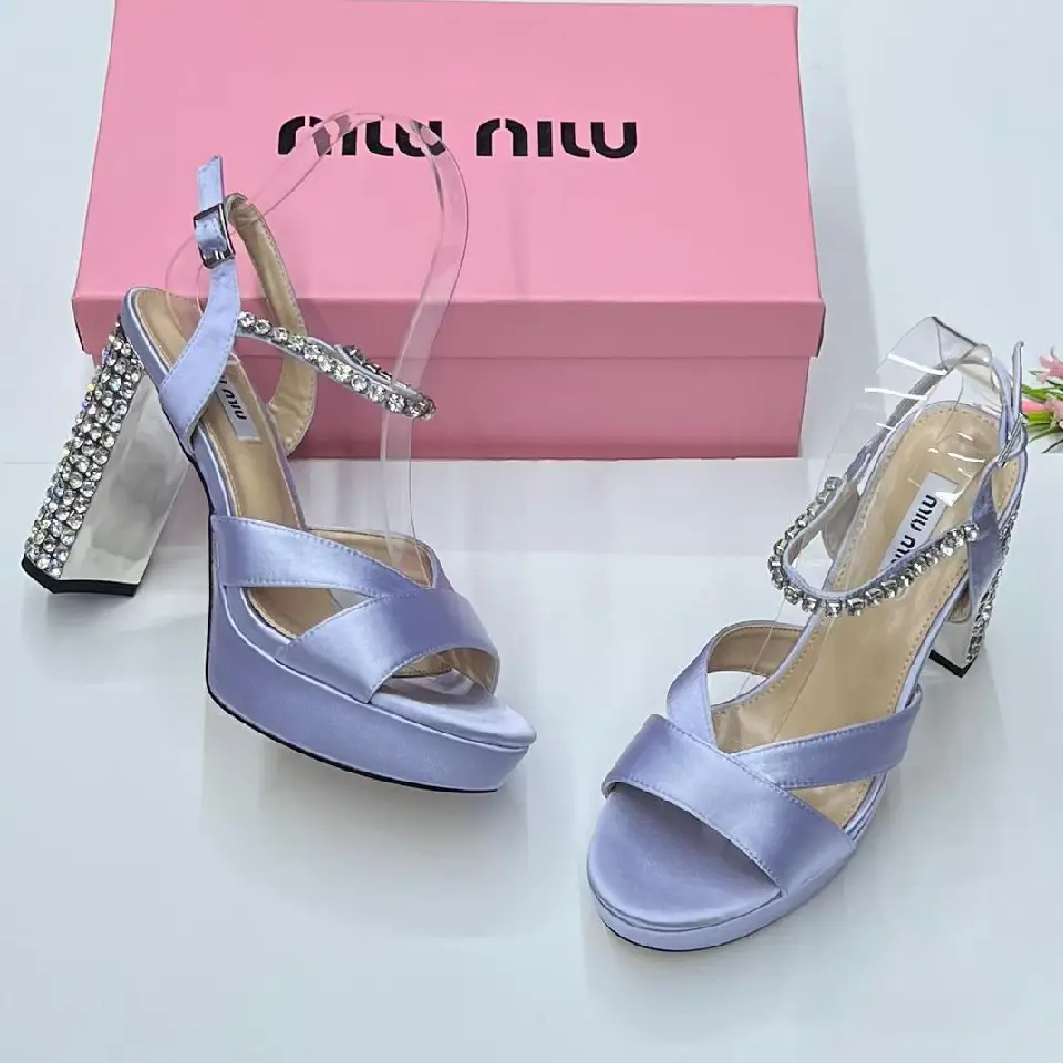 Miu Miu Women’s Square Toe Crystal Heels – Light Purple Satin Chunky Heel Pumps in Dubai UAE