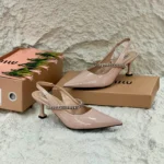 Known for their wearable heel height and refined detailing, Miu Miu pumps are ideal for all-day wear without compromising on style. The clean lines and minimalist design make them a versatile addition to any wardrobe—pair them with tailored trousers, a midi dress, or even denim for a refined yet relaxed look. With Miu Miu, comfort and high fashion walk hand in hand.