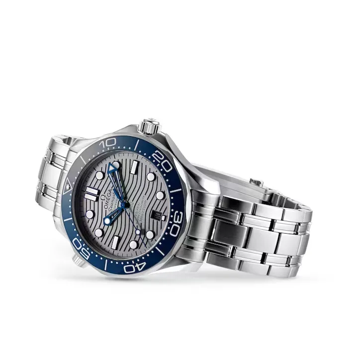 The Omega Seamaster Diver 300M Co-Axial Master Chronometer 210.30.42.20.06.001 is a striking timepiece that embodies both elegance and high-performance functionality. Featuring a 42mm stainless steel case, this watch is built for durability and adventure. The polished grey ceramic dial, enhanced by the signature laser-engraved wave pattern, adds a unique depth to the design. Complementing the dial is a blue ceramic bezel with a white enamel diving scale, ensuring precision during underwater activities. The skeletonized hands and raised hour markers are coated with Super-LumiNova, providing excellent legibility in low-light conditions. Additionally, a date window at 6 o’clock enhances practicality, making this watch perfect for both daily wear and professional diving.