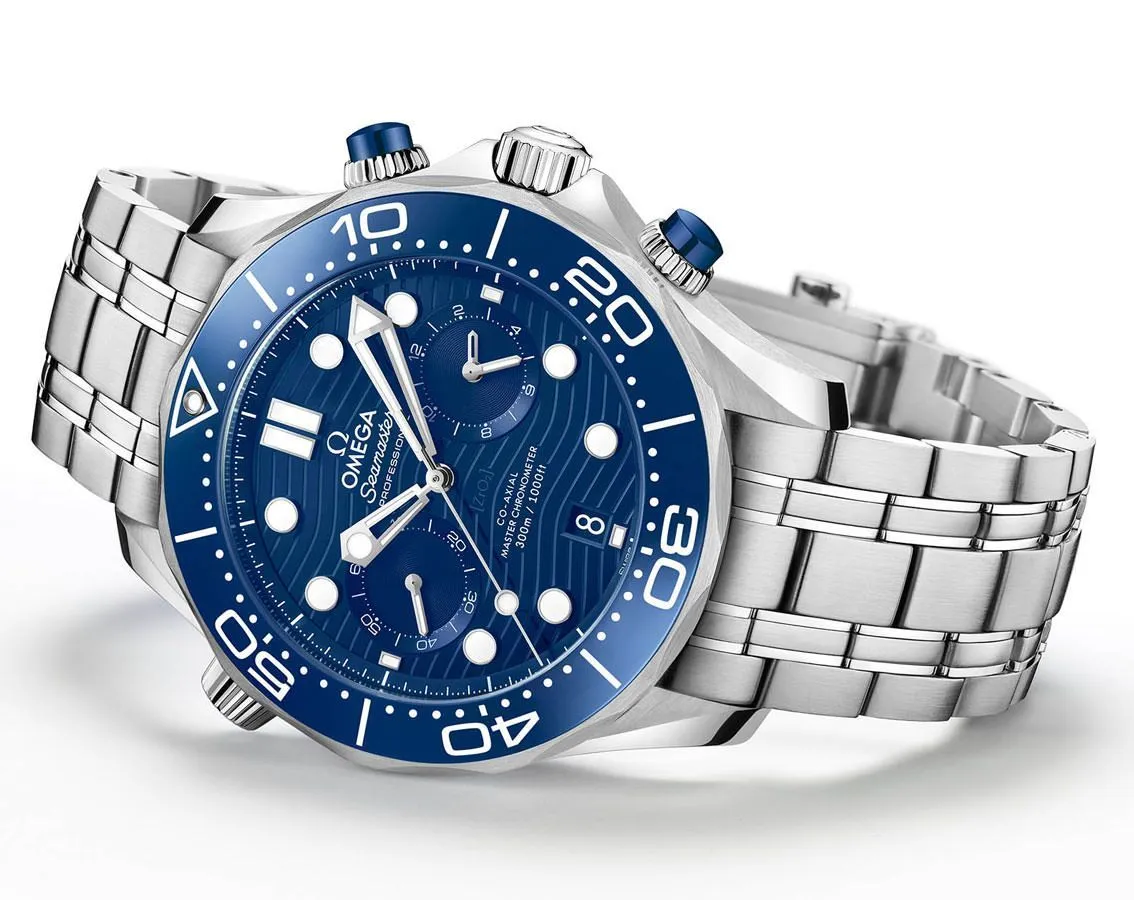 The Omega Seamaster Diver 300M Co-Axial Master Chronometer 210.30.44.51.03.001 is a striking timepiece that blends cutting-edge technology with a bold and elegant design. Featuring a 44mm stainless steel case, this chronograph watch boasts a blue ceramic dial with the signature laser-engraved wave pattern, adding depth and character to its aesthetic. The unidirectional rotating ceramic bezel is fitted with a white enamel diving scale, ensuring precise dive timing. The sub-dials at the 3 and 9 o’clock positions enhance its chronograph functionality, while the Super-LumiNova-coated hands and indexes offer exceptional readability in low-light conditions. The helium escape valve makes it a professional-grade dive watch, ensuring safe decompression for saturation divers.