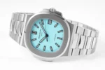 The Patek Philippe 5711/1A Nautilus Tiffany-Blue is one of the most iconic and sought-after timepieces in the world of luxury watches. This stunning version of the Nautilus features the signature Tiffany blue dial, a unique and striking color that has garnered immense popularity and become synonymous with exclusivity and high-end watchmaking. The 40mm stainless steel case is polished to perfection, giving the watch a refined and durable finish. The dial is beautifully complemented by the classic Nautilus design, featuring applied hour markers, a date window at 3 o’clock, and sleek, luminescent hands, all balanced perfectly for legibility and aesthetic appeal. This model represents a harmonious fusion of sportiness and elegance, a characteristic hallmark of the Nautilus line.