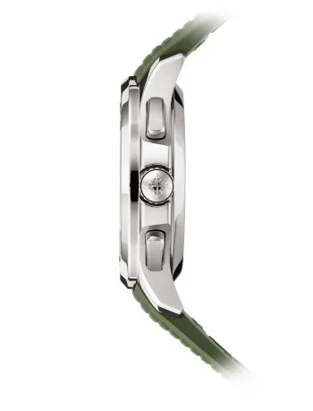 The Patek Philippe 5968G-001 Aquanaut Khaki Green is an exciting addition to the Aquanaut collection, blending sporty aesthetics with luxurious craftsmanship. The 42.2mm white silver case provides a stunning contrast to the bold khaki green dial, which features the collection’s signature embossed pattern, adding texture and depth to the design. The white silver hour markers and hands, coated with luminescent material, ensure optimal legibility in various lighting conditions, while the date window at 3 o’clock adds practicality without disrupting the dial’s sleek look. The rotating inner bezel for a second time zone further enhances the functionality of this timepiece, making it a sophisticated companion for the modern traveler.
