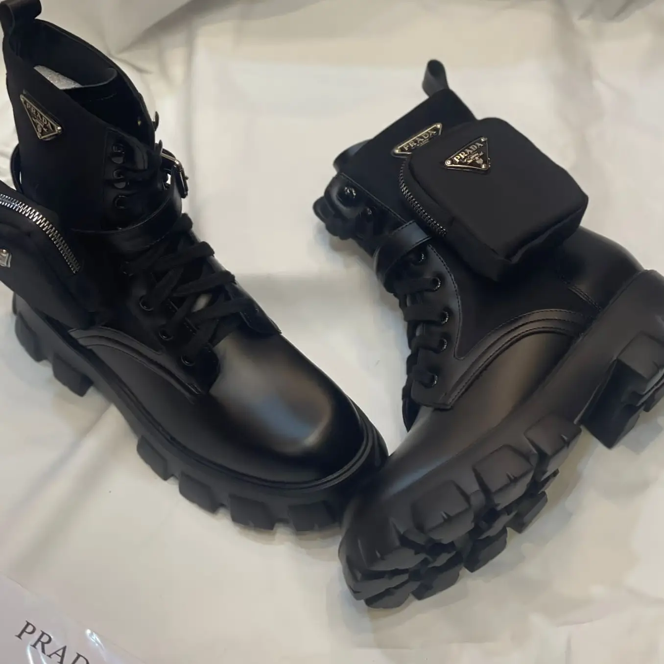 Bold, functional, and fashion-forward, the Prada Men’s Monolith Brushed Leather and Re-Nylon Boots with Pouch embody the brand’s modern approach to luxury. As part of the iconic Monolith line, these boots stand out with their chunky block sole, striking a perfect balance between utility and avant-garde design. Crafted from a mix of brushed leather and Re-Nylon—a sustainable material derived from recycled plastic waste—these boots represent Prada’s commitment to environmental consciousness without sacrificing style. The detachable pouch, adorned with the signature triangle logo, adds a versatile and edgy touch, making these boots both practical and distinctive.