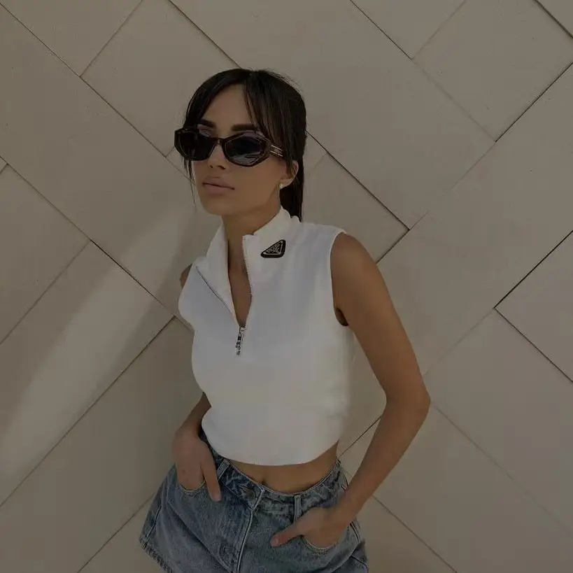 Prada Ribbed Knit Jersey Tank Top – White Sleeveless High-Neck Top with Triangle Logo in Dubai UAE