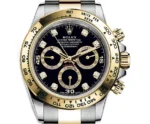 The Rolex 116503 Daytona Black Set with Diamonds is a stunning fusion of luxury and high-performance engineering. Crafted from Rolex’s signature Rolesor combination of 18k yellow gold and Oystersteel, the 40mm Oyster case ensures durability while exuding elegance. The deep black dial, adorned with brilliant-cut diamond hour markers, elevates the watch’s sophistication, making it a true statement piece. The yellow gold tachymeter bezel, engraved with a speed scale, reinforces the Daytona’s racing heritage, allowing for precise speed calculations. With Chromalight luminescence on the hands, this timepiece offers optimal readability, blending sportiness with refined luxury.