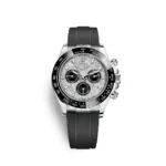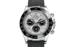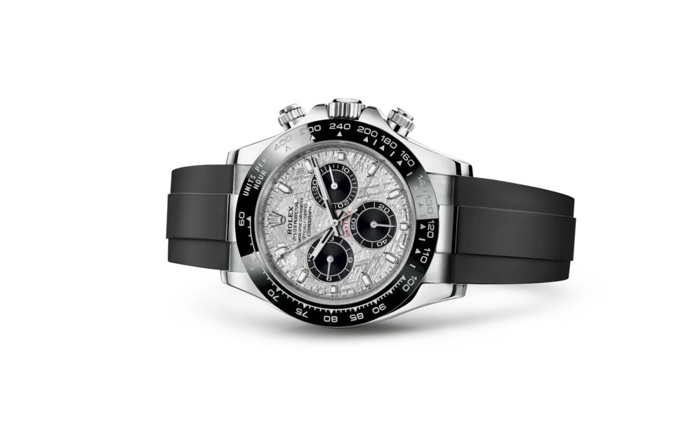 The Rolex 116519LN Daytona Meteorite is a masterpiece that merges cosmic rarity with Rolex’s signature craftsmanship. Crafted from 18k white gold, the 40mm Oyster case delivers an elegant yet sporty aesthetic, making it a standout piece in the Daytona collection. The genuine meteorite dial, featuring naturally occurring crystallized patterns, ensures that each watch is truly unique. Complemented by black sub-dials, the dial maintains the Daytona’s classic chronograph layout while enhancing contrast and readability. The black Cerachrom ceramic bezel, engraved with a tachymeter scale, reinforces the timepiece’s racing heritage while providing superior scratch resistance and durability.