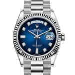 Beneath its stunning exterior, the Rolex 128239 Day-Date Blue Ombré w/D is powered by the Rolex Caliber 3255, a self-winding movement renowned for its exceptional precision, efficiency, and 70-hour power reserve. The watch is paired with a luxurious 18k white gold President bracelet, known for its comfort and elegance, and is equipped with the Crownclasp, ensuring a secure fit. With a water resistance of 100 meters, the watch is built to withstand everyday wear while maintaining its sophisticated charm. The Rolex 128239 Day-Date Blue Ombré w/D is a true symbol of luxury, combining Rolex’s cutting-edge technology with exquisite design to create a timepiece that is both functional and a work of art.