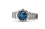 The Rolex 128239 Day-Date Blue Ombré w/D is a luxurious and visually captivating timepiece that exemplifies Rolex’s mastery in both design and craftsmanship. Crafted from 18k white gold, the 36mm Oyster case offers a refined yet substantial feel on the wrist, making it perfect for those who appreciate understated elegance. The standout feature of this model is its blue ombré dial, which transitions from a lighter shade at the center to a deeper, richer hue at the edges, creating a mesmerizing depth and uniqueness to each watch. The dial is complemented by diamond hour markers, enhancing the luxury appeal of the Day-Date while offering clear legibility. The Day and Date windows at 12 and 3 o’clock positions make this model a true hallmark of the iconic Day-Date collection.